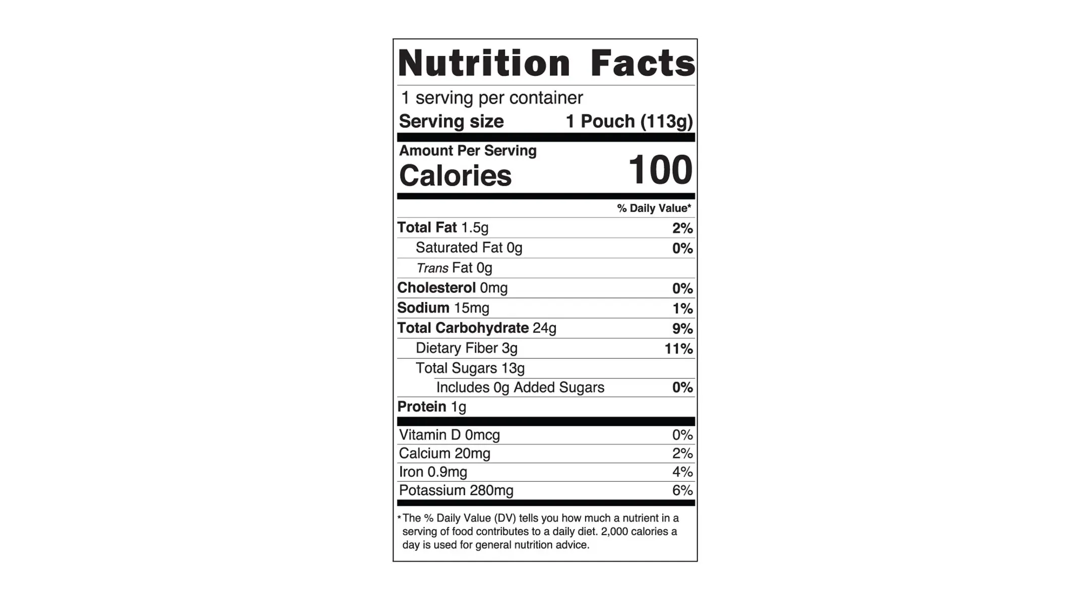 Each 4-ounce pouch contains 1g protein, 1.5g fat and 24g of carbohydrate in 100 calories.