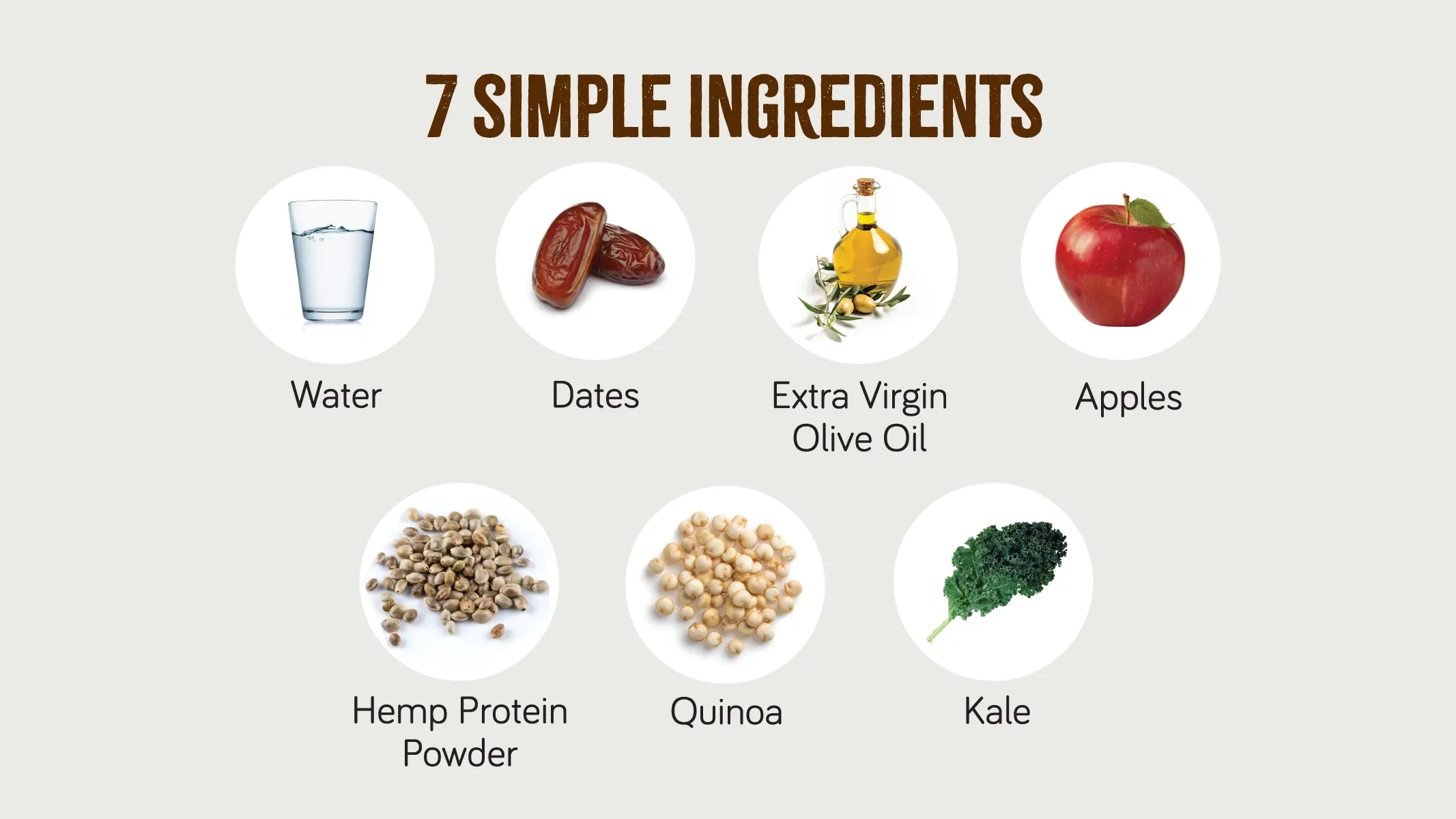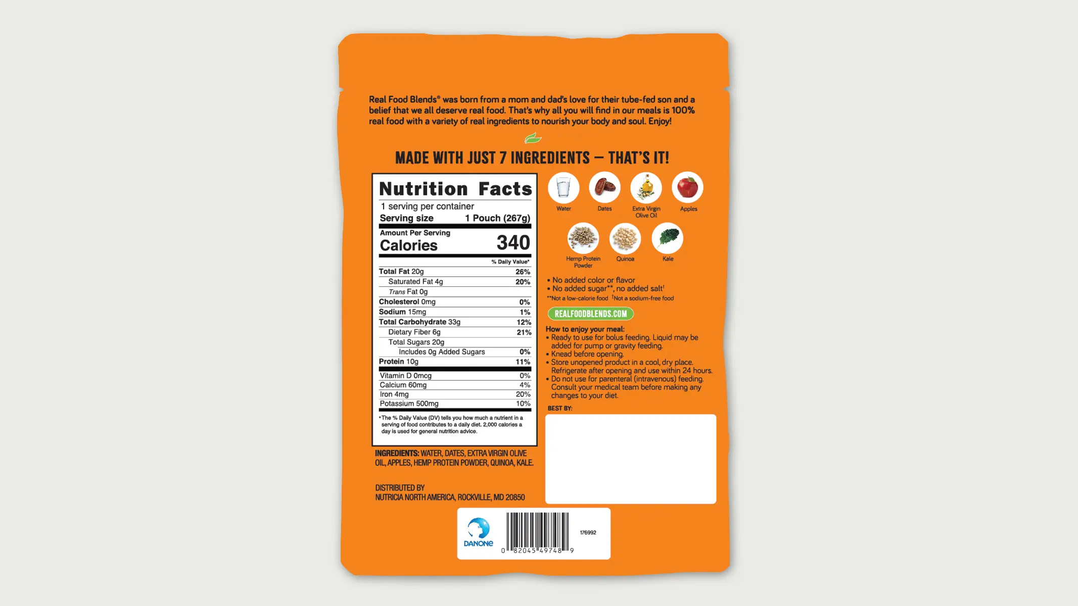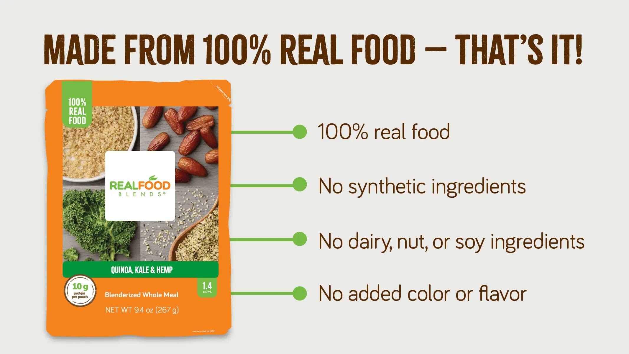 • 100% Real Food – Blended whole meal of 7 real food ingredients: Water, Dates, Extra Virgin Olive Oil, Apples, Hemp Protein Powder, Quinoa, Kale.